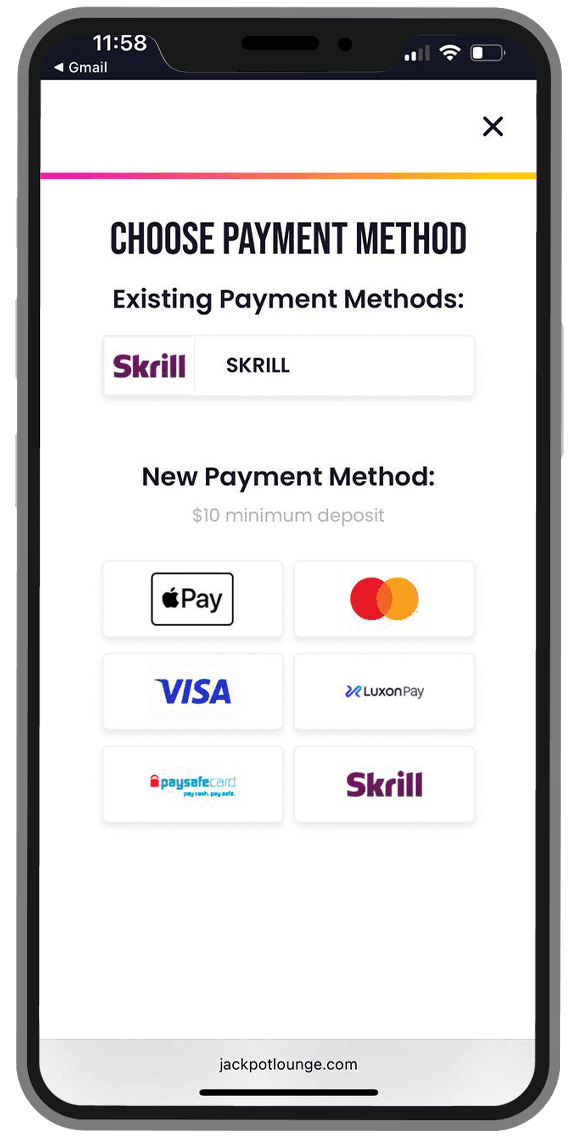 Deposit options: Visa, Mastercard, Paysafecard, Skrill, Neteller, Google Pay, Apple Pay, MiFinity, Neosurf, POLi, Jetonbank, Skinsback, USDT Tether (ERC20, TRC20, BEP20), BTC Bitcoin, ETH Ethereum, DOGE Dogecoin, BCH Bitcoin Cash, BNB Binance Coin, LTC Litecoin, TRX Tron, XRP Ripple…