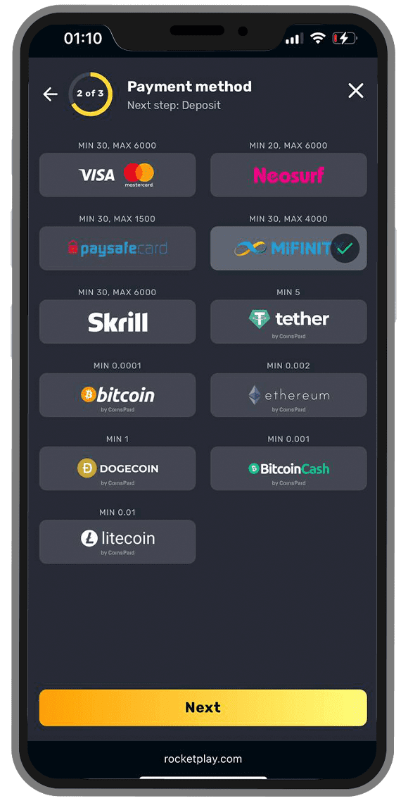 Deposit options: Visa, Mastercard, Paysafecard, Skrill, Neteller, Google Pay, Apple Pay, MiFinity, Neosurf, POLi, Jetonbank, Skinsback, USDT Tether (ERC20, TRC20, BEP20), BTC Bitcoin, ETH Ethereum, DOGE Dogecoin, BCH Bitcoin Cash, BNB Binance Coin, LTC Litecoin, TRX Tron, XRP Ripple…