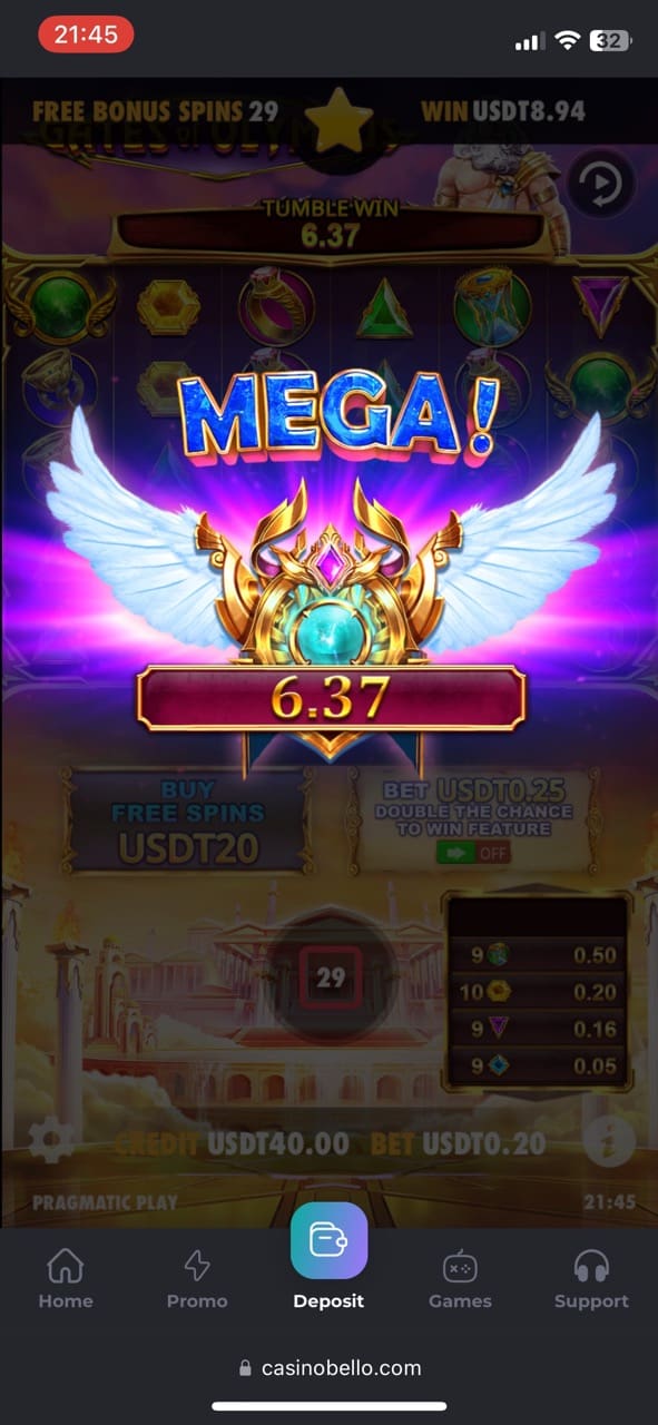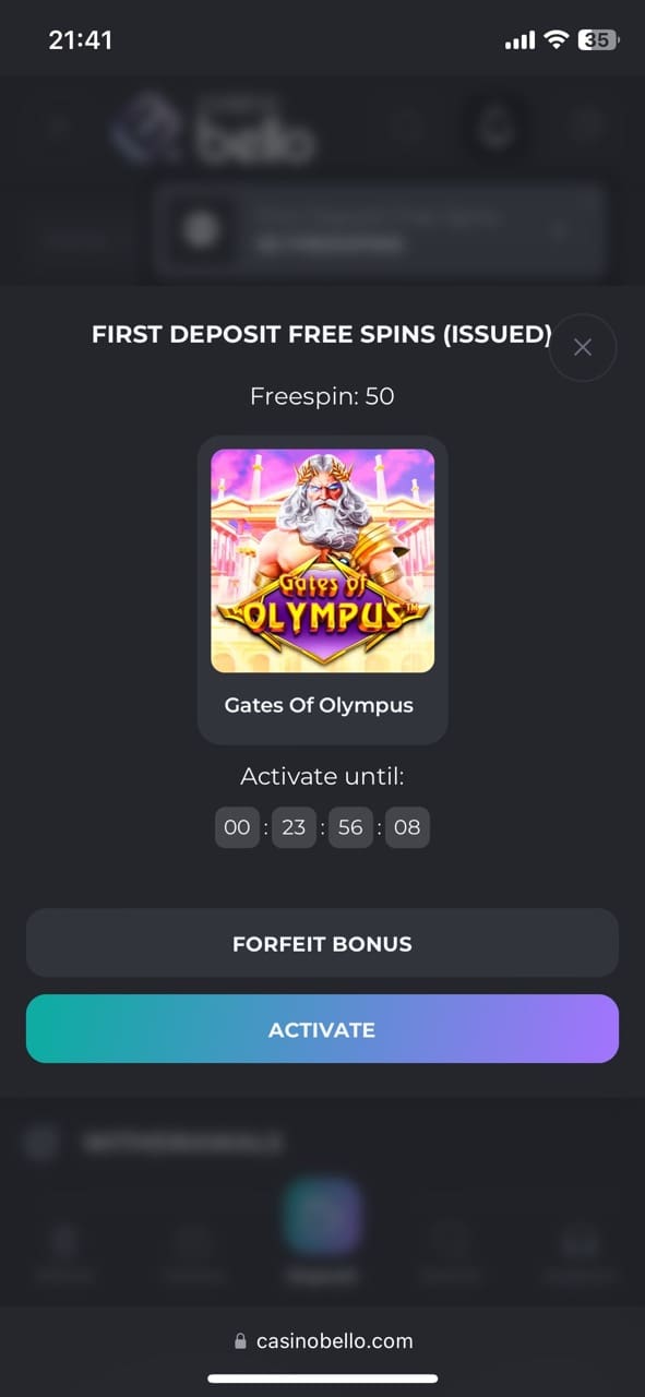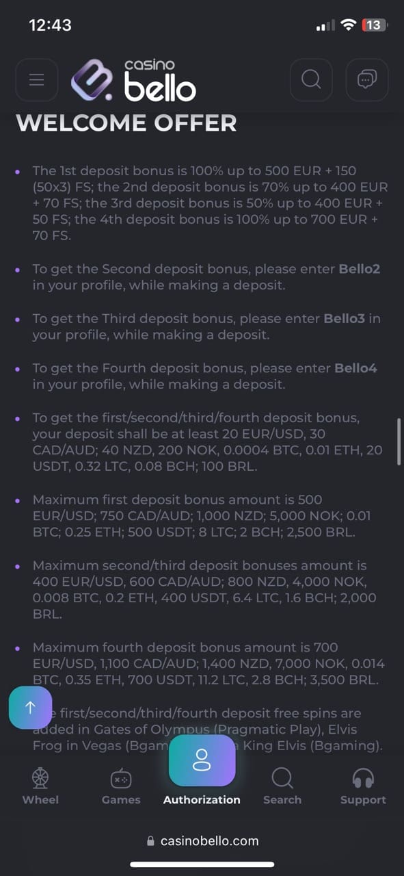 Every Wednesday, CasinoBello customers have a lucky chance to claim up to 150 free spins with the promo code WDFS. To get free reel spins on the best pokies from the lobby, including Gates of Olympus, Big Bass Splash, Book of the Fallen by Pragmatic Play or Aloha King Elvis by BGaming. You should deposit at least 35 EUR/USD, 60 NZD or 0.0006 BTC, 0.015 ETH, 30 USDT, 0.48 LTC, 0.12 BCH if you use digital currencies. And the wagering requirement is x40.