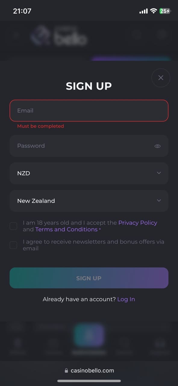 Registration at CasinoBello Online Casino NZ