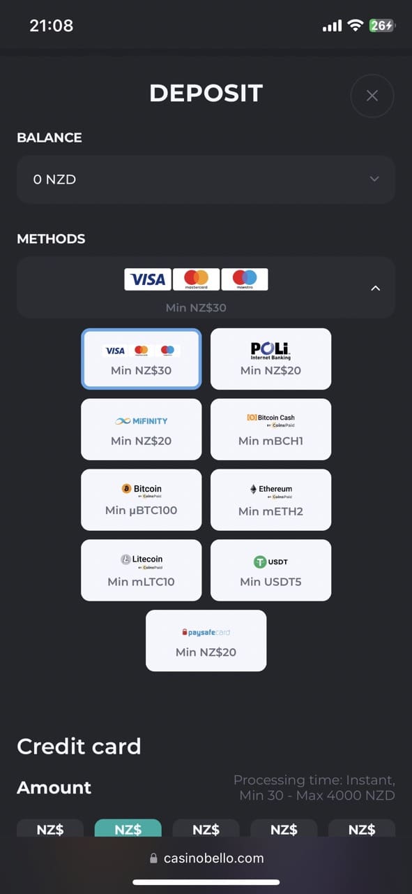 I was stoked by the number of deposit and withdrawal methods CasinoBello offers Kiwis for a convenient and safe experience. Please check my table with all the payment options and limits. Note that regardless of the payment methods, your transaction will be processed instantly. Also, no fees are involved. That’s choice!
