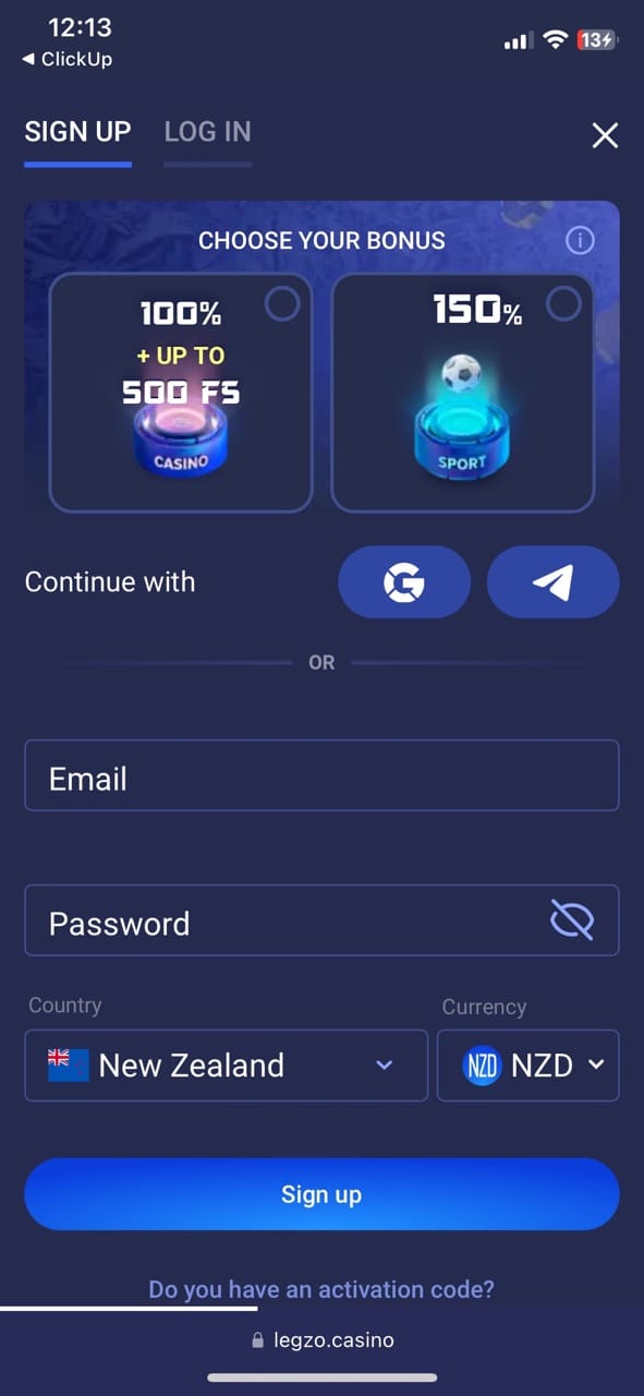 Note that you can also sign up using your Google or Telegram account. Don’t forget to tick the box confirming your legal gambling age and allow Legzo Casino to send your promotional offers.