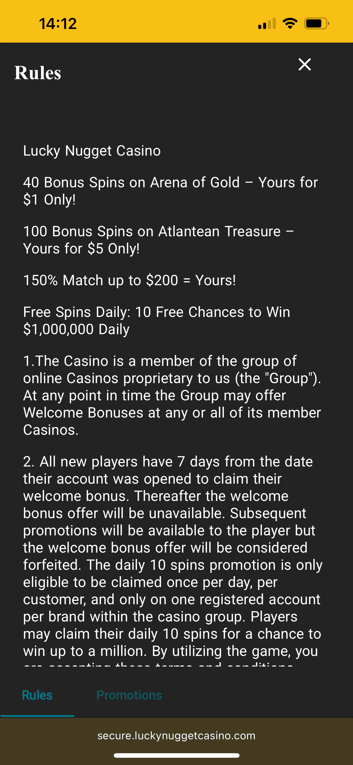 Lucky Nugget Casino NZ holds a Malta licence. The brand operates within a wider group of online casinos, so welcome offers may vary by landing page/brand within the group. New players typically have 7 days from account opening to claim a welcome bonus route; once a welcome is taken at a group brand, additional playthrough may be required before another group welcome can be claimed.