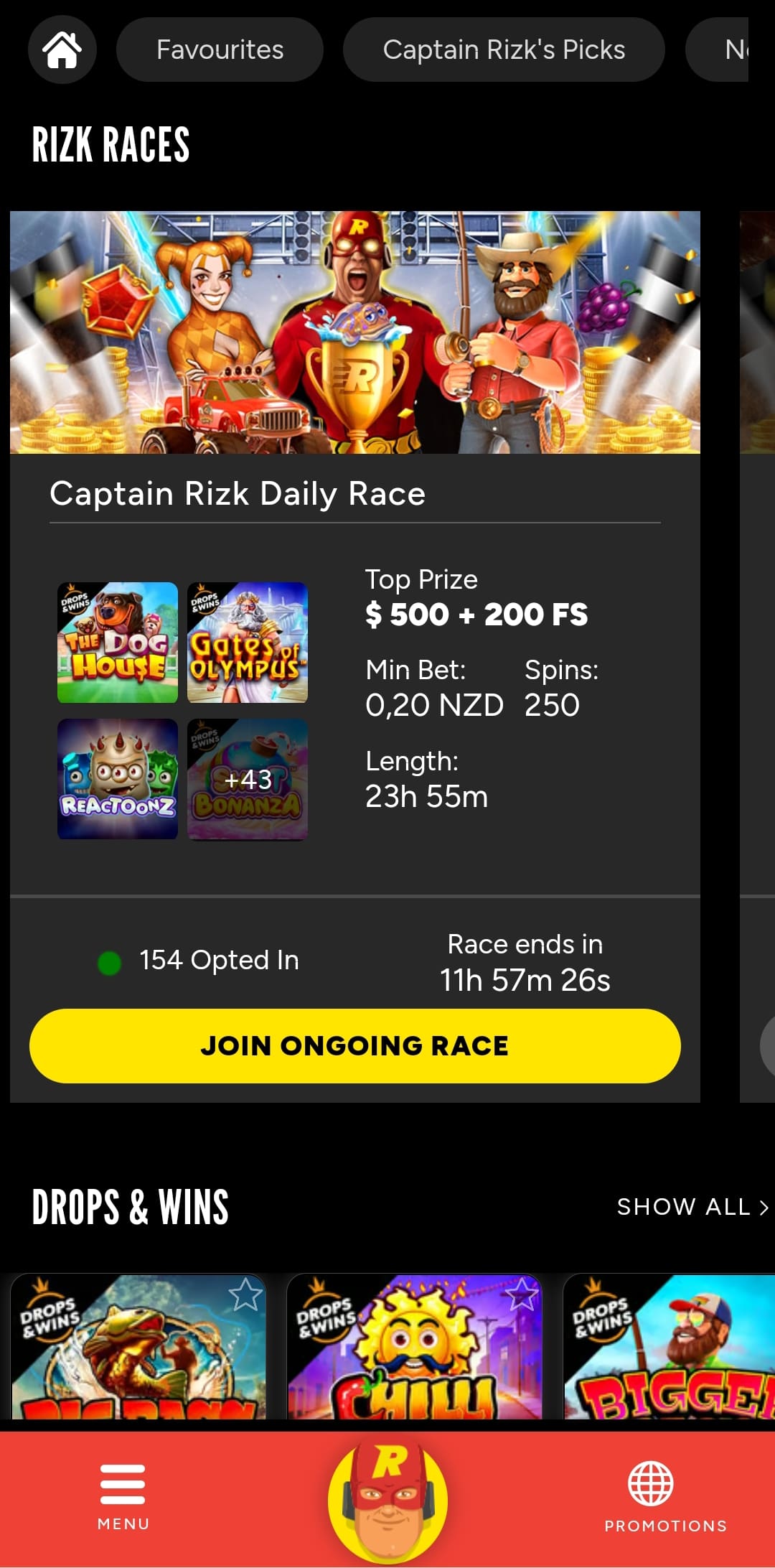 Captain Rizk Daily Race starts, well, every day, mate. The prize was NZ$500 plus 200 free spins on Gates of Rizk for the person who wins it, with NZ$250 plus 100 FS for the second place, and so on. The rules are simple – you gain points by playing pokies. Every 250 spins you play your score is recorded and you start over. You must opt-in to join the Rizk Races. And there’s no reason why you wouldn’t want to. Depending on your luck while you play your pokie, you could win big.