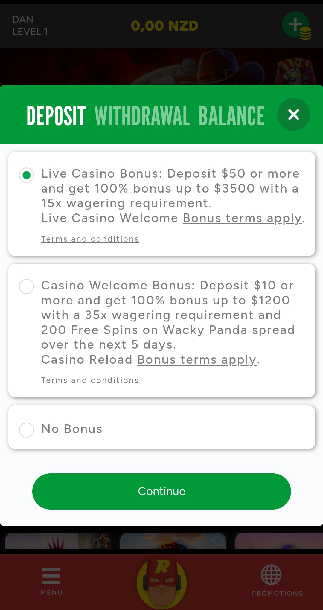 As you can see in the screenshots, you’re given a choice between two bonuses: one for live casino games and the other for pokies. The live casino bonus is a rare offer, a gem that live casino players will certainly know how to appreciate!
