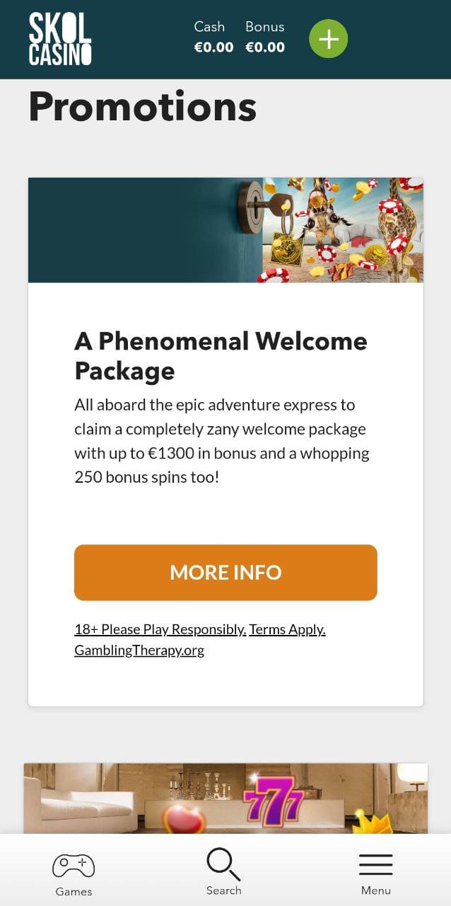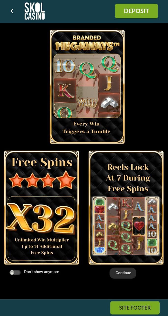 I must say right off the bat that I dislike the mobile website. The navigation menus and things to click are always where I don’t expect them to be, and I feel Skol isn’t taking full use of the screen, it looks empty, there is no way to ever see more than nine pokies on a single screen at the lobby. If you already have only nine then fill the screen with them, don’t show such small icons. I also didn’t like the splash screen when I clicked the pokie. I just want to play.