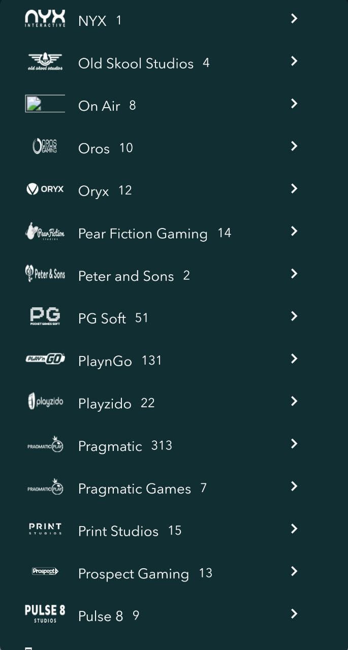 1x2 Gaming, 4ThePlayer, Ad Lunam, AGS, Ainsworth, Alchemy Gaming, All41 Studios, Apollo Gaming, Area Vegas, Armadillo Studios, Asylum Labs, Aurum, Authentic Gaming, AvatarUX, BGaming, Big Time Gaming, Blue Guru Games, Blue Ring Studios, Blueprint Gaming, Booming Games, Buck Stakes, BullShark, Chance Interactive, Coin Machine, Colossus Bets, Crazy Tooth Studio, Crucible, Design Works, DWG, Electric Elephant, ELK Studios, Endemol, Evolution, Ezugi, Fantasma, Felt, Fortune Factory, Four Leaf, Foxium, Gacha, Gameburger, Games Inc, Gamevy, Gaming Corps, Gold Coin, Golden Rock, Gong Gaming Tech, Greentube, Hacksaw Gaming, Half Pixel Studios, Hammertime Games, High Limit Studios, IGT, Infinity Dragon, INO, Inspired Gaming, Iron Dog, Jade Rabbit, Jelly Games, JustForTheWin, Kalamba, Lady Luck, Leander, Leap Gaming, Lightning, Live 5 Gaming, Lucksome, Max Win, Merkur, Microgaming, Nailed It, Neko, Neon Valley, Net Gaming, NetEnt, NoLimit City, Northern Lights, NYX, Old Skool, On Air Entertainment, Oros, Oryx, Pear Fiction, Peter and Sons, PG Soft, Play'n GO, Playzido, Pragmatic Play, Print Studios, Prospect Gaming, Pulse 8, Push Gaming, Rabcat, RAW iGaming, Realistic Games, Red 7, Red Rake Gaming, Red Tiger, ReelPlay, Reel Time Gaming, Relax, Revolver Gaming, Ruby Play, S Games, Scientific Games, Silverback, Skywind, Slingo, Slingshot Studios, Snowborn Games, Spearhead, Spin Play, Spinmatic, Spinomenal, Stakelogic, Storm Gaming, Stormcraft, Swintt, Switch Studios, Synot Games, Thunderkick, Tom Horn Gaming, Triple Edge Studios, Wazdan, Wishbone Games