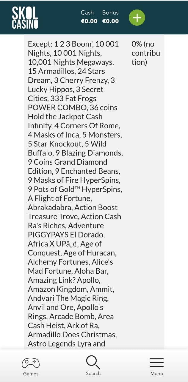 Skol Casino is fixated on not letting you play high-RTP slots to meet the wagering requirements. All slots contribute 100% except for 13 specific pokies that contribute 20% and a long list of almost 500 pokies that contribute 0%! Five hundred pokies! That’s a fifth of the portfolio.