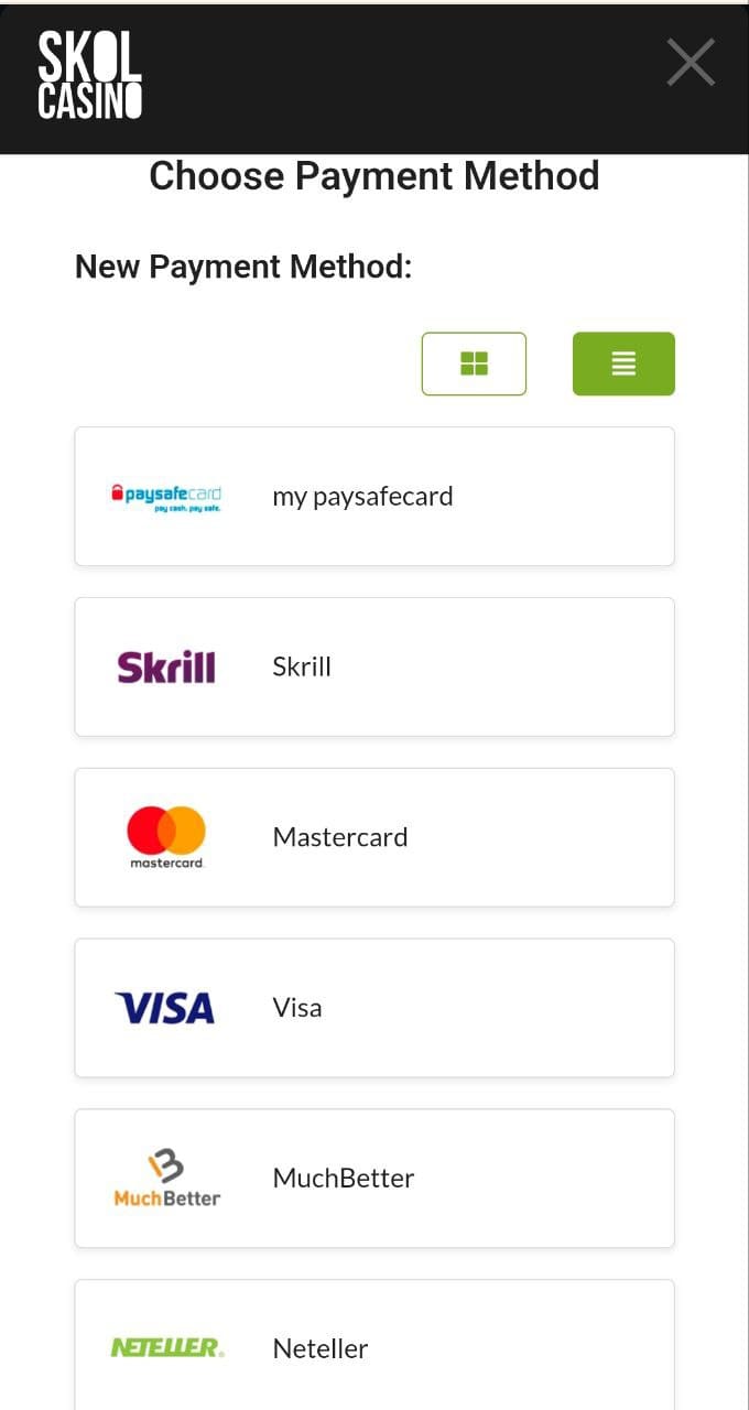 Paysafecard, Visa, Mastercard, Skrill, Neteller, MuchBetter
