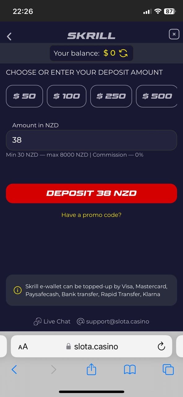 Slota will require you to complete verification. If you don’t, your withdrawals will decline. So, my personal advice is to verify your account and docs before you play for real cash. Once you win, you will be able to request a cash out without a mare of a job. Withdrawal time at Slota takes from an hour to a few days. The fastest ways to get your well-deserved NZD are Bitcoin and Skrill.