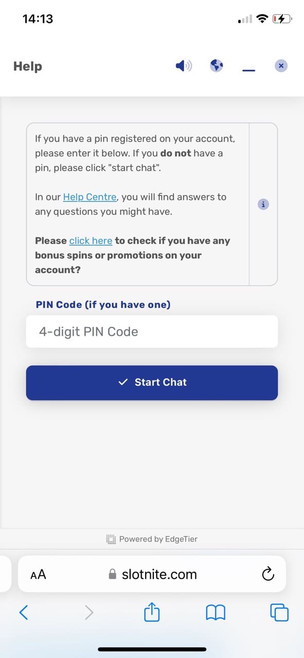 I always test customer support because I think quality help is essential regardless of the matter, whether it is technical issues, payment, or bonus terms. In order to reach the staff in the chat, you need to create a 4-digit PIN code. I had to enter all the same data as they required during registration. Once I did that, I was assigned a PIN code. I then had to use this pin to get help. I think it is quite weird since I had an account by the time I wanted to ask a question in live chat. So why do I need to provide my details again? It reminded me of Casimba casino: they had exactly the same procedure.