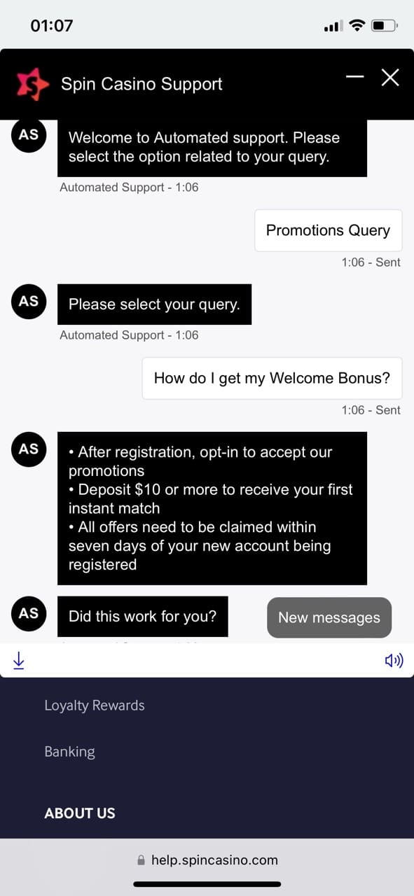 Spin Casino says their customer support is available 24/7 and offers friendly live chat. According to my experience, I think the casino does not have real people. When testing their customer support, I was chatting to a bot. There is a help center where you can find information on withdrawals, certification, promos, and responsible gambling.