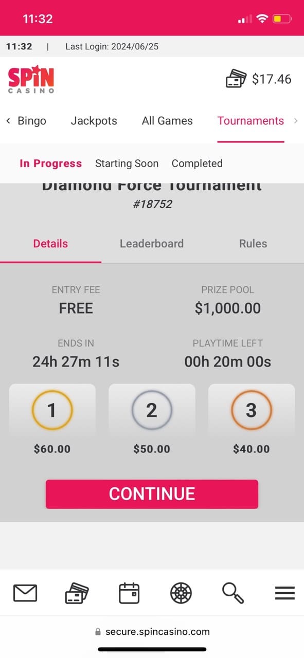 Spin Casino carries two types of tournaments: free tournaments, which are available every 24 hours and allow 50 Kiwi players to share a prize pool of $1000, and leaderboard tournaments, played over a few days or weeks and give a chance to more than 300 New Zealanders to win real cash prizes and find their names on a leaderboard. I found that when you enter a tournament, your wagers and payouts are tournament credits and cannot be exchanged for real money that you can spend at Spin Casino.