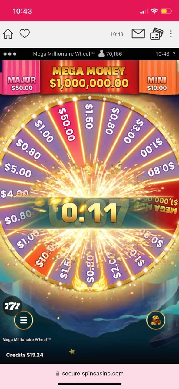 Every 4 hours, the casino gives players an opportunity to spin the bonus wheel. I spun it but haven’t won anything. Another opportunity to win some cash is the Mega Millionaire Wheel, I got 10 free spins to spin it daily. Spin Casino says players can win a million, but I think this promise is too loud since I won something like 1 NZD or less.