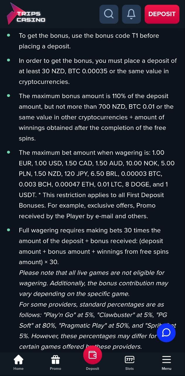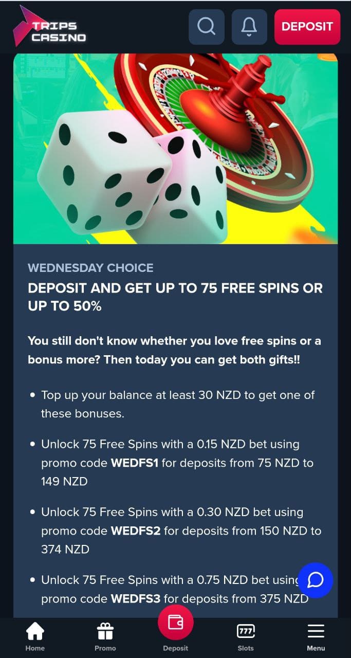 Trips Casino Welcome Bonus 110% up to 700 NZD + 75 Free Spins