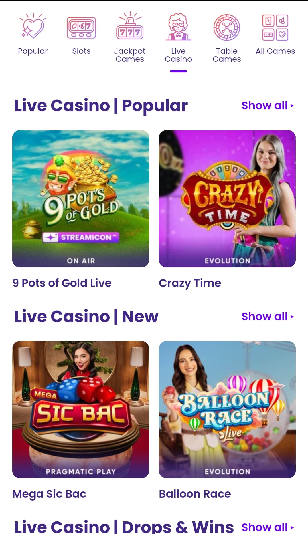 Live Casino has superb navigation and a lobby that will have you going round in circles as you try out the games one by one. Evolution and Pragmatic Play are running the show and are bringing you some of the most exciting live games to play, and OnAir Entertainment and Stakelogic are here to bring the necessary variety.
